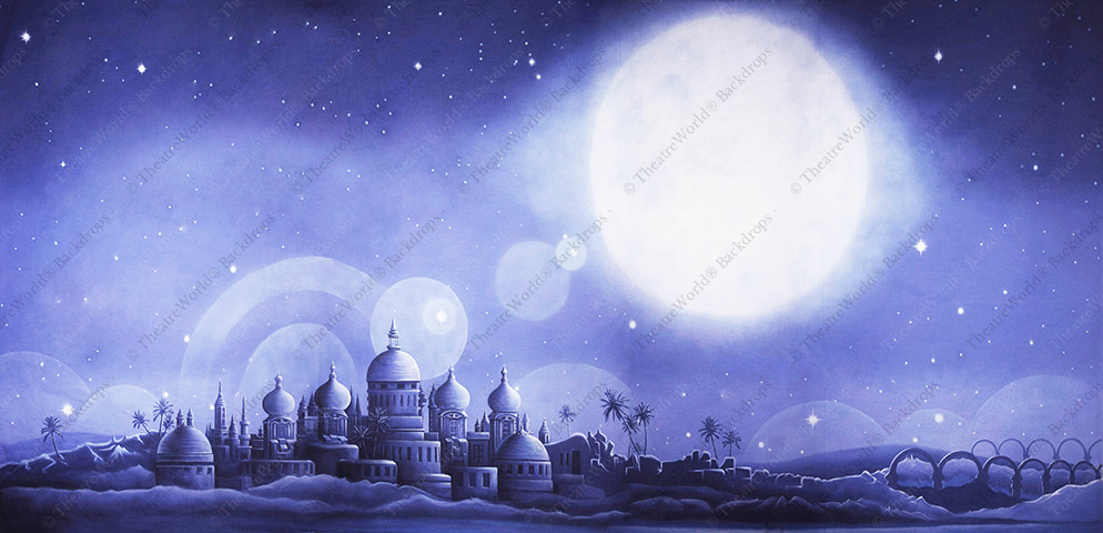 A gorgeous backdrop depicting a river bank Arabian city under a night sky with a full moon. This drop is also available with a crescent moon or no moon.