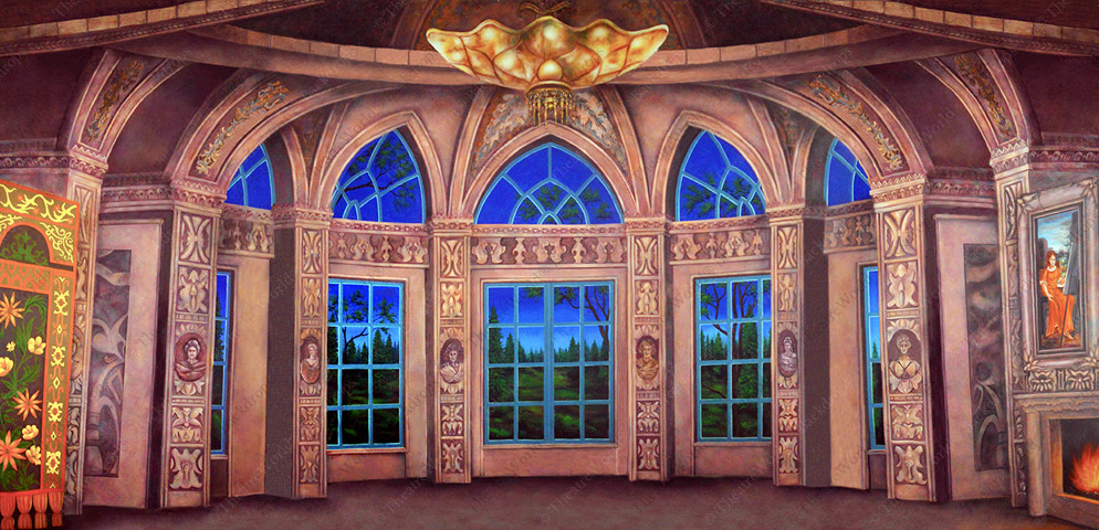 This backdrop depicts old world carvings, lush bay windows, a flowing tapestry, stunning paintings, and a burning fire. Also available in a Christmas version.