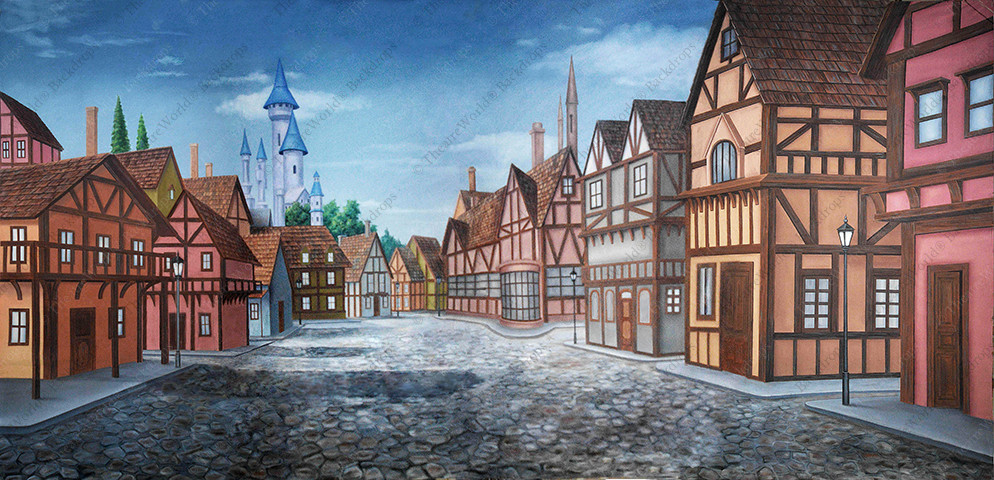 "Little town… It's a quiet village!" Bonjour! Feast your eyes on this glorious backdrop from TheatreWorld's BEAUTY AND THE BEAST Collection. Inspired by both the Disney animated film and Broadway stage version of BEAUTY AND THE BEAST, this backdrop perfectly depicts Belle's village town square for the opening scene of this classic. Also available in a more Disney version with brighter colors.