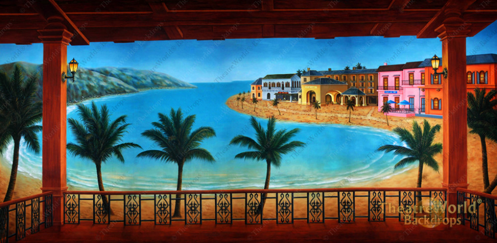 The sister backdrop to our very popular La Ensenada de Musica, this gorgeous tropical cove and seaside village rests beyond the gorgeous iron balcony of a tropical establishment under a beautiful clear sky and calming, clear blue water.