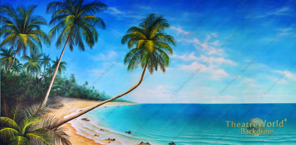 This popular backdrop features a beautiful secluded tropical cove! Elegant palms, soft sands and calm, aqua waters under a relaxing sky grace this drop! Perfect for any show, event or theme requiring a tropical location.