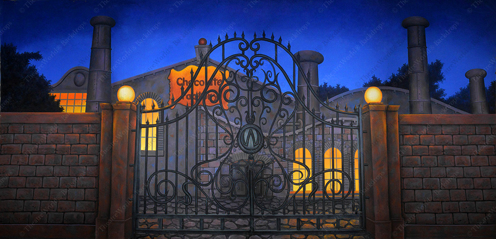 Bring a little sweetness to your stage with this storybook design, featuring a large "Chocolate Factory" warehouse hidden behind an imposing "W" engraved solid iron gate. Perfect for as a main drape or exterior view of your next golden ticket inspired confectionery trip!