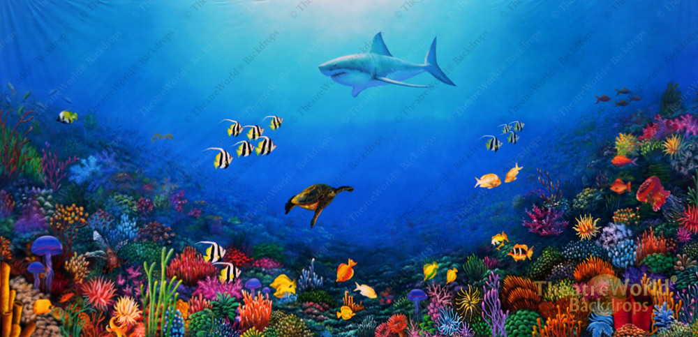 This stunningly beautiful under the sea backdrop is simply one of the finest available in the industry! Colorful coral, sea plants, jellyfish, angel fish, turtles and other deep sea creatures come to life in this immaculate piece as a shark passes by overhead. Perfect for stage productions and under the sea themed events as well. Also available without the shark featured.