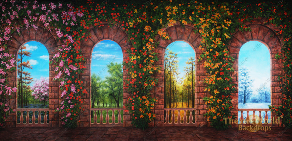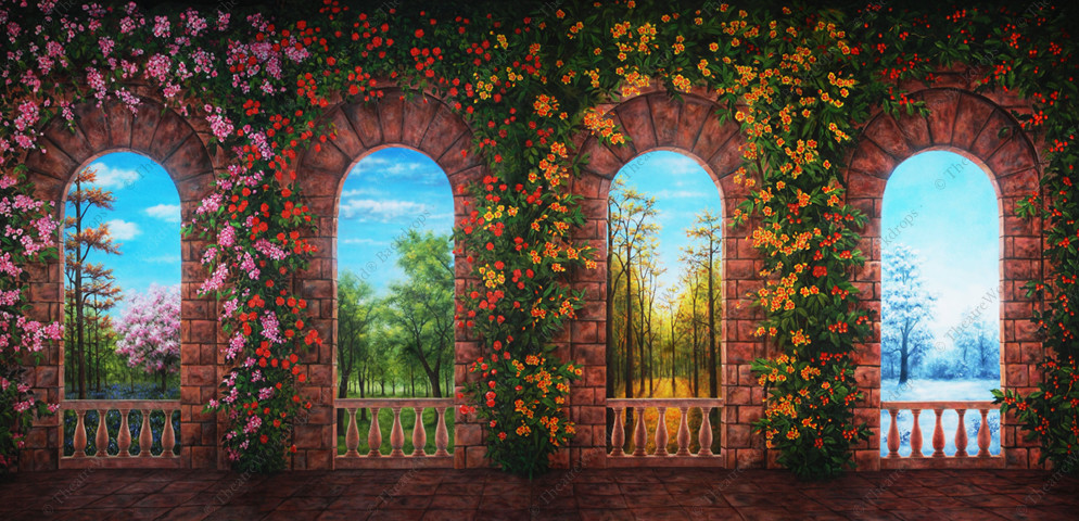 This immaculate backdrop is the sister to our popular Rose Terrace drop. This backdrop features an extraordinarily detailed field stone terrace. The arches beautifully reveal wooded scenes depicting the four seasons of spring, summer, autumn, and winter. Seamlessly woven seasonal flower vines including cherry blossoms, roses, orchids, and holly stunningly frame each appropriate seasonal arch.