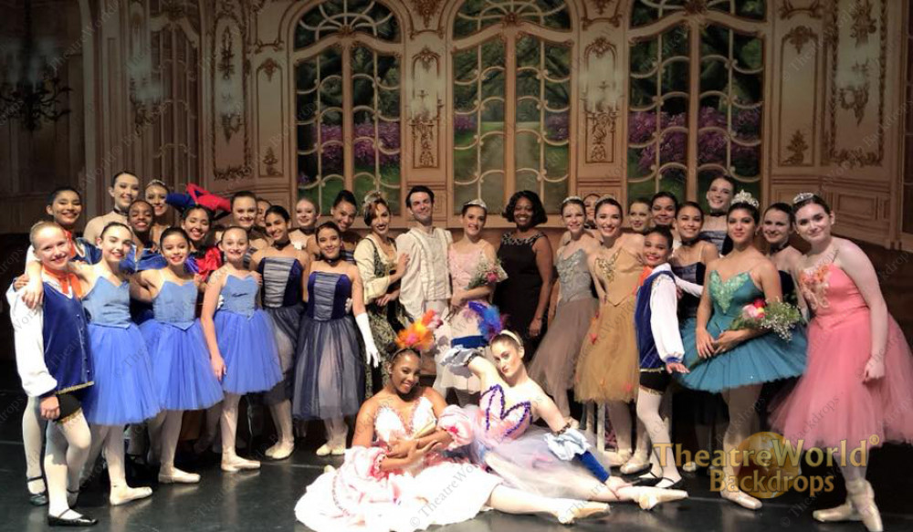 Our gorgeous and incredibly detailed “Garden Ballroom” is perfect for everything from fairy tale favorites, like Beauty and the Beast to Cinderella and Little Mermaid to classic musicals, such as the Sound of Music, and so many more! Featuring intricate gold detailing on soft cream-colored walls, this candlelit ballroom interior with a polished wooden floor leads out to a beautiful green and pink garden beyond! Step into sheer elegance with this backdrop!