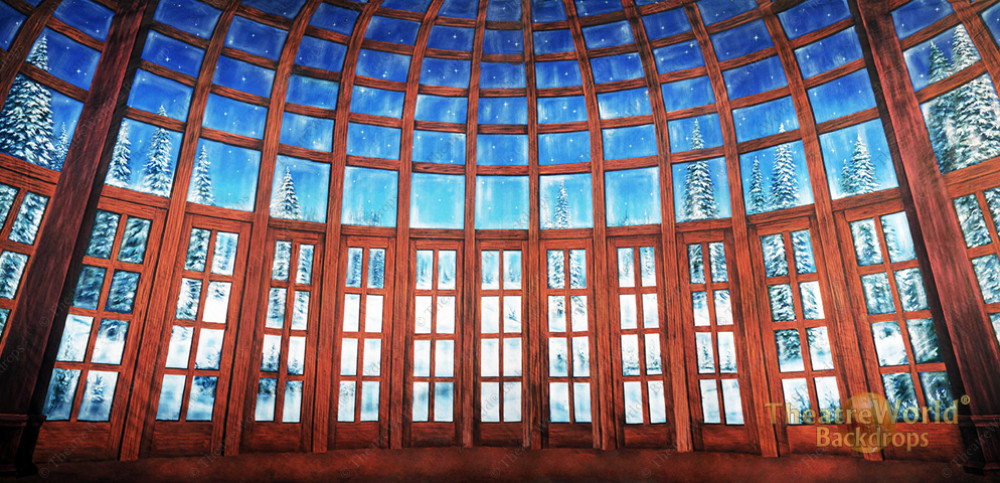 TheatreWorld's Glass Palace Foyer was developed for productions of THE NUTCRACKER to work seamlessly with the Nutcracker Christmas Tree backdrop and Christmas Present legs! An elegant glass foyer built out of sturdy oak reveals a stunning winter wonderland with snow topped firs outside! Perfect for THE NUTCRACKER or many other holiday productions and themes.