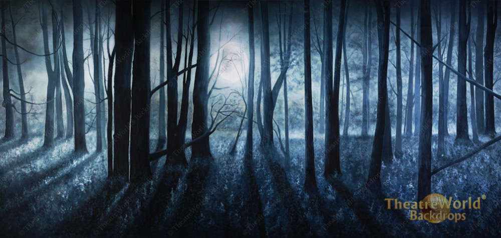 A spooky, photo-realistic backdrop in gray-scale featuring a full moon through the trees of a dark forest. Perfect for Halloween-themed events or for productions of the Broadway musicals CATS, FIDDLER ON THE ROOF or INTO THE WOODS. Also available in a blue colorized version.