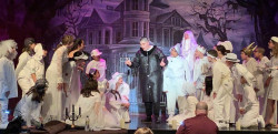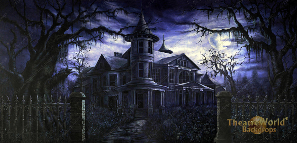 Creepy meets kooky in this detailed backdrop created for TheatreWorld's ADDAMS FAMILY collection. The Addams Family's haunted mansion sits in the background under an ominous full moon and framed by spooky trees, dead foliage, and an old wrought iron and brick fence in the foreground! The perfect backdrop to compliment your graveyard set pieces on stage! Perfect for Halloween and haunted theme events as well!
