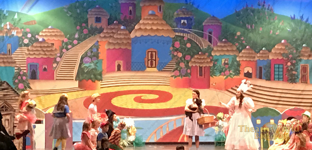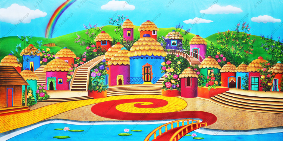 This backdrop is ready for Dorothy's arrival in Munchkinland and features the yellow brick road, munchkin houses, a colorful bridge, and a rainbow in the sky. Also available without Dorothy's house on the left.