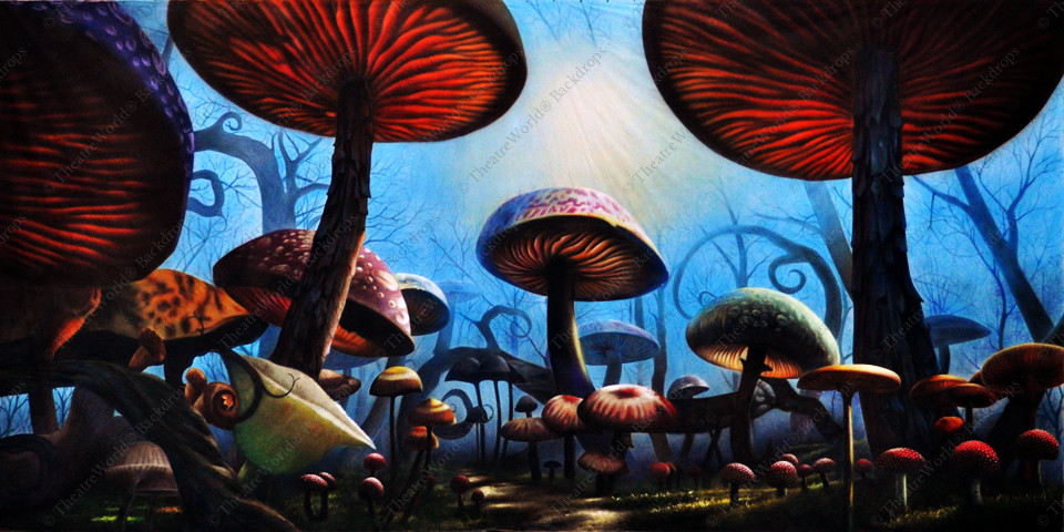 This backdrop features a captivating, over-sized mushroom forest inspired by the Disney/Tim Burton version of ALICE IN WONDERLAND.