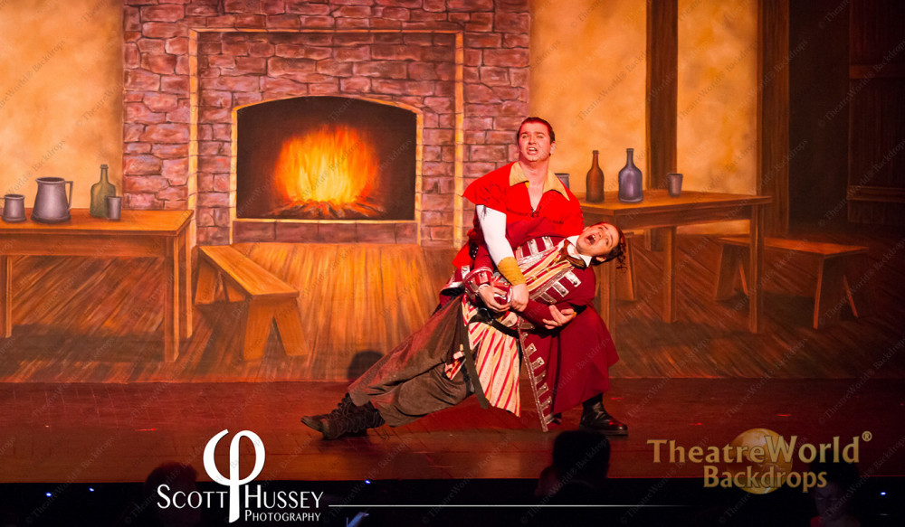 An old world European tavern interior featuring wood timber framing, a stone fireplace, barrels of ale, and warm plaster walls. Also available in a log cabin style.