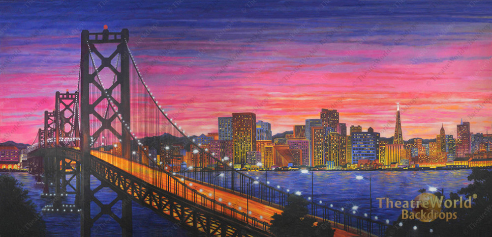 An artist rendition of the famous Golden Gate Bridge in Northern California with a colorful sunset sky overlooking the 3 mile channel separating San Francisco Bay and the Pacific Ocean.