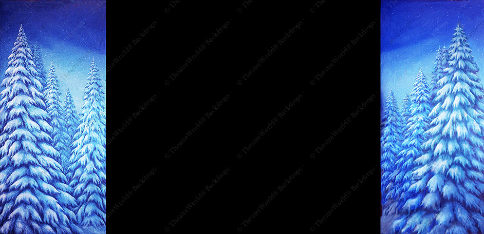 A peaceful, snowy tree ridge leg set complete with snow-laden Douglas firs under an enchanting blue night sky. Add depth to your stage and frame your scene with our matching Snowy Christmas Tree Ridge teaser header and main drape!