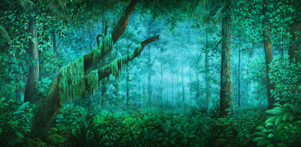 This tropical forest backdrop features a deep jungle-like space full of green foliage, Spanish moss, ferns, and a quiet mist. Complete the package with our matching teaser header and leg set!