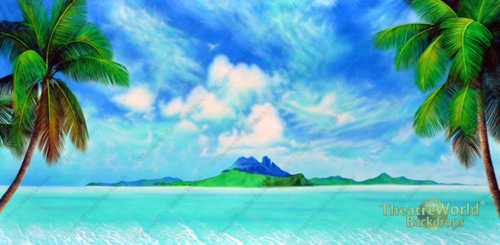 This serene backdrop features palm trees overlooking tranquil waters with a distant volcanic island in the distance.