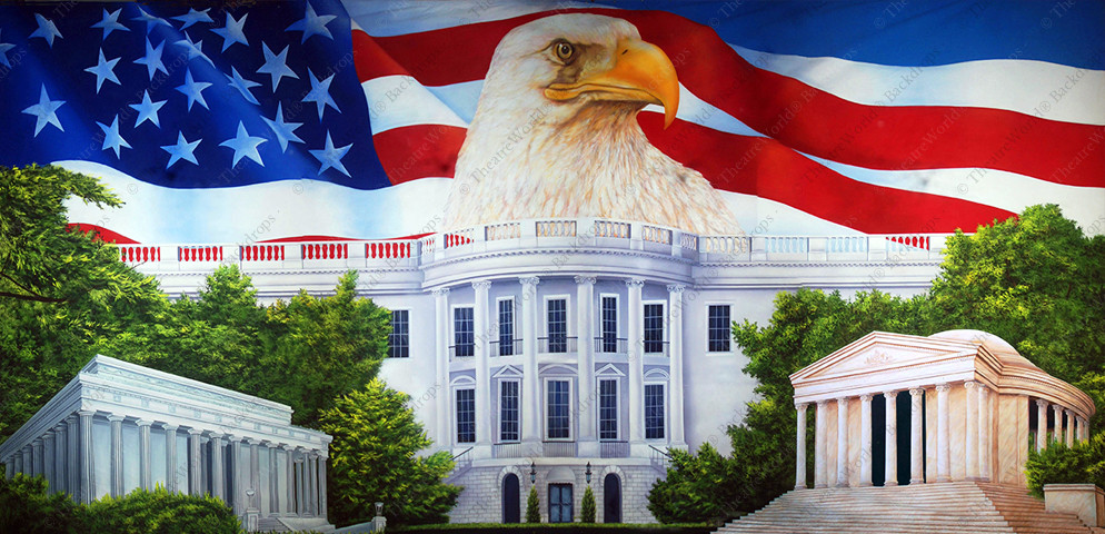 A beautiful collage of historic Washington, DC landmarks featuring the White House, the Lincoln Memorial, and the Jefferson Memorial, with a bald eagle and a rippled American flag in the background.