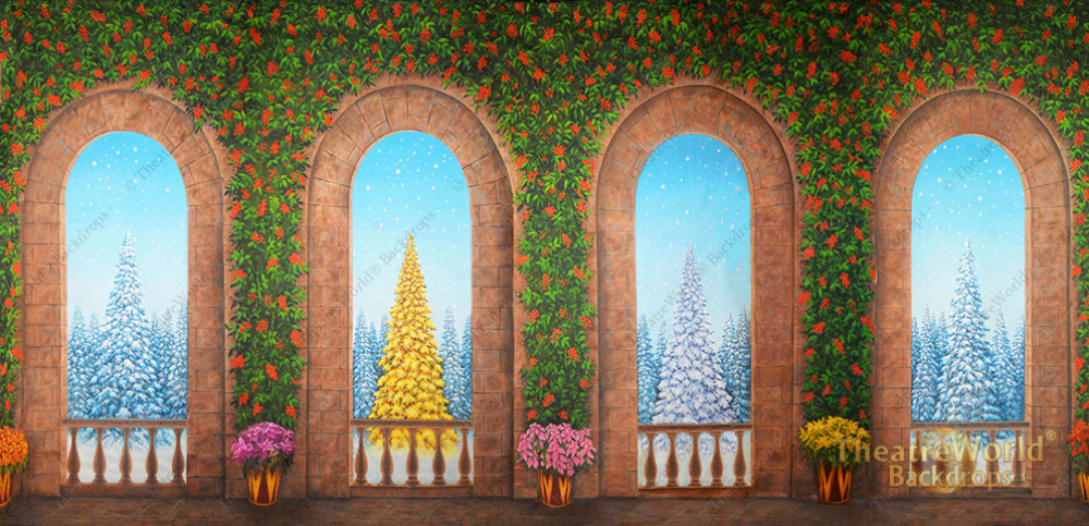 This holiday version of our Rose Terrace design features a snow-covered winter scene and a golden Christmas tree. Complete the look with our matching Rose Terrace Header and Leg Set.
